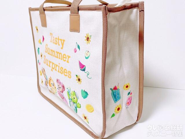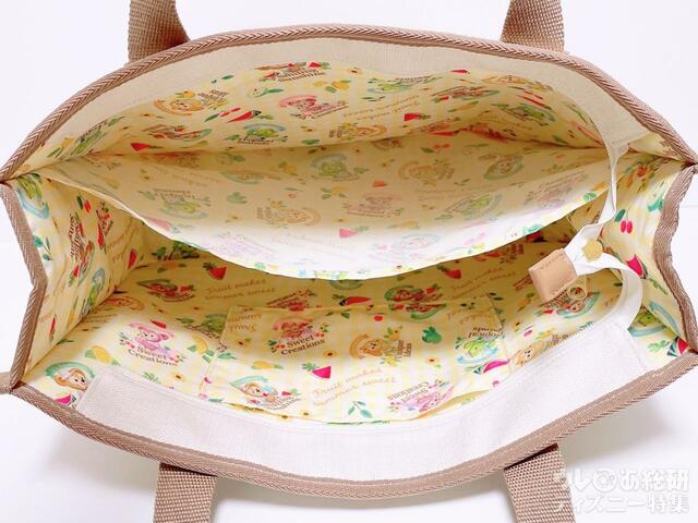 内布は淡いイエローのギンガムチェックに、フルーツやダッフィーたちの総柄。
