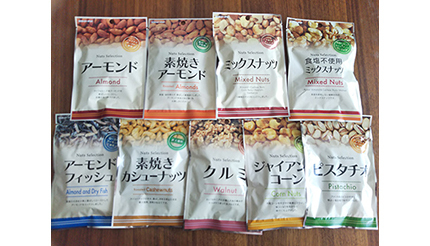 ナッツは美容や健康にいいと言われ、食生活に取り入れる人が増えている。また、昔からナッツは乾きもののおつまみの定番だ。キャンドゥで販売しているナッツ類は種類が豊富で、110円の安さで手に入る。しかも量が控えめなので食べすぎ防止にも役立つ。今回は、筆者がよく行くキャンドゥにあった同じシリーズのナッツを9種類購入し、すべて食べてみた。