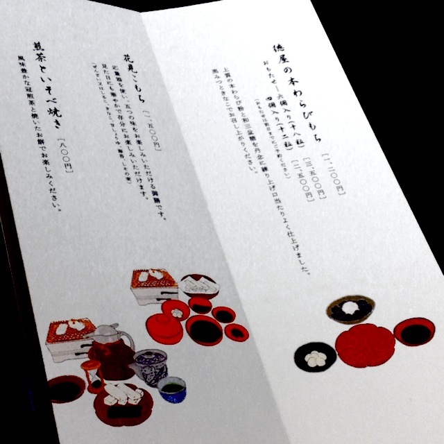 さて注文ですが、わらび餅は外せませんね。でも注文をしてから練り上げるので15分くらい掛かります。その間にぎおん徳屋の五つの味を味わえる花見こもちとこの季節にはぴったりのパフェを頂きながら待つ事にしましょう!