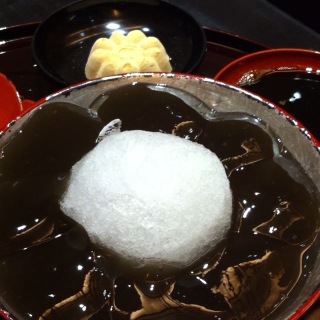 山高にこんもりと敷き詰められたかき氷の上に、練りあがったばかりの本わらびもちが光っています。和三盆を入れて練り上げられているので、少し茶色見をおびていますね。美味しそうです。