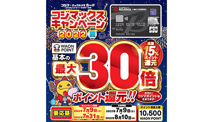 ビックカメラグループのコジマは、「コジマ×ビックカメラカード」のクレジットカード支払いの買い物でWAON POINTが最大30倍還元される「コジマックスキャンペーン2022夏」を7月9~31日の間、コジマ店頭とコジマネット(自社サイト)で実施する。