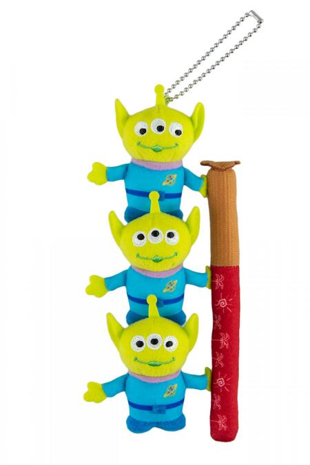 ぬいぐるみバッジでは、リトル・グリーン・メンが肩車で3人並んで、チュロスと背比べをしているみたい。
