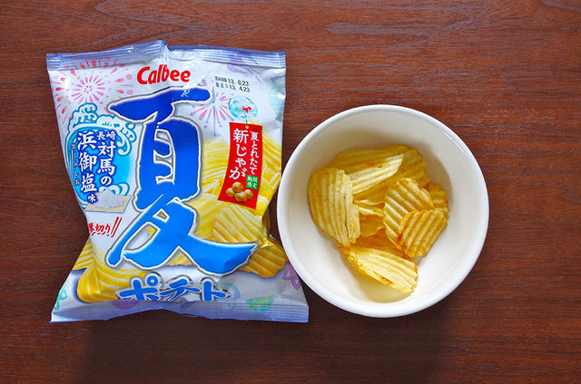 サクッとした食感の“夏仕様”のポテトチップス。採れたての新じゃがが使われています。対馬の海塩「浜御塩」にトマトや昆布のうま味を加え、ポテトチップスなのに脂っぽくない、さっぱり感を実現しています。表面の形状も独特で食感も抜群です。塩の効いたライトな味わいが美味しく、つい1袋食べ切ってしまいそうなので危険……。