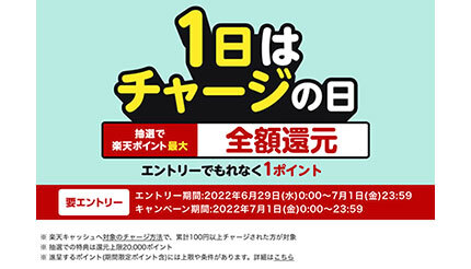 楽天Edyは、楽天キャッシュへの対象の方法でのチャージを対象に「1日はチャージの日!抽選で楽天ポイント最大全額還元!」キャンペーンを7月1日の1日限りで実施している。