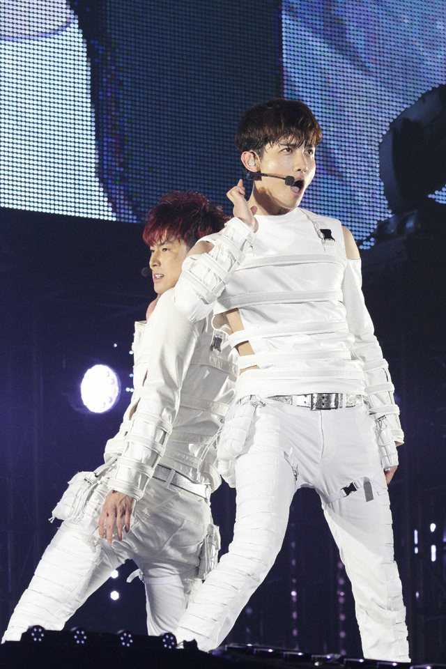 中世の騎士を連想させる白い衣装に身を包んだふたりがリフトで登場すると、場内から割れんばかりの大歓声があがった。そして『ANDROID』『Superstar』といったアップテンポなダンス曲を披露し、「皆さんと僕たちのどちらが先に疲れるかの勝負です。最初からガンガンに盛り上がって行くから最後までちゃんと付いて来て!」(ユンホ)、「この夢の時間を皆さんとひとつになって、最高の思い出を作りたいです」(チャンミン)と叫び、ライブの幕を開けた。