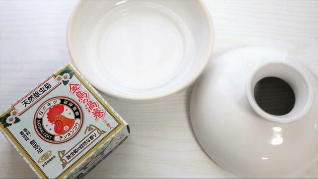 市販の蚊取り線香を付属スタンドごとお皿型のパーツに設置し、火をつけたら上のパーツをかぶせます。