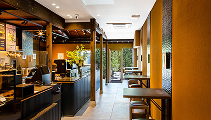「THE CITY BAKERY 京都錦小路」は、“京の台所”と呼ばれる40年以上の歴史を持つ商店街である京都錦市場内にオープンし、壁、梁、天井をそのまま生かした店内を進むと、心地よい水音が流れるテラス席のある中庭、その先には歴史ある蔵を改装したモダンな空間が広がる。