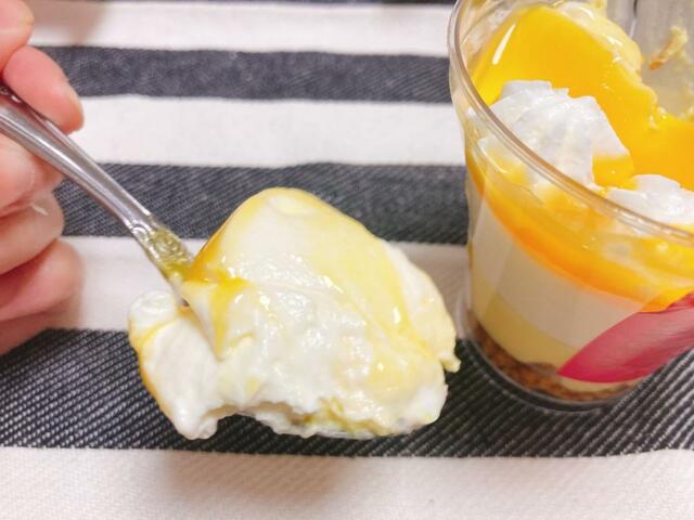 ひと口すくって口に運ぶと、パッションフルーツソース&ムースのさっぱりした味わいを感じます。