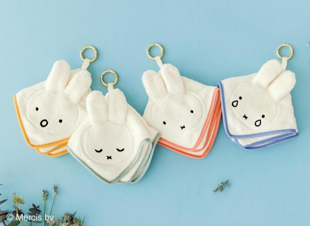 いろいろな表情のミッフィーがかわいい、ふわふわのハンドタオル。耳に指を入れるとパペットみたいに遊べます。