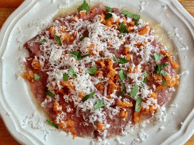 【ニショク】「カルパッチョ〜和牛ハツの低温調理~」。ニンジンかと思ったが、いい意味で裏切られた