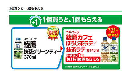 ファミリーマートでは7月18日まで、「コカ・コーラ 綾鷹 抹茶グリーンティー 370ml」を買うと「コカ・コーラ 綾鷹カフェ ほうじ茶ラテ/抹茶ラテ 各440ml」のいずれか1個の無料引換券がもらえるキャンペーンを実施中。7月12日から開催している同キャンペーンも、本日が最終日なので忘れずにゲットしよう。