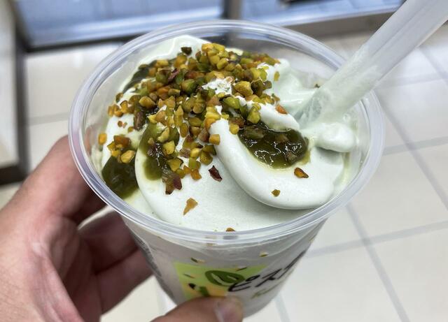 基本は甘いミルクベースなのですが、そこに加わったピスタチオソースのコク、さらに粒々のピスタチオが食感のアクセントになり、やけにクセになる味わいでした。