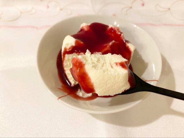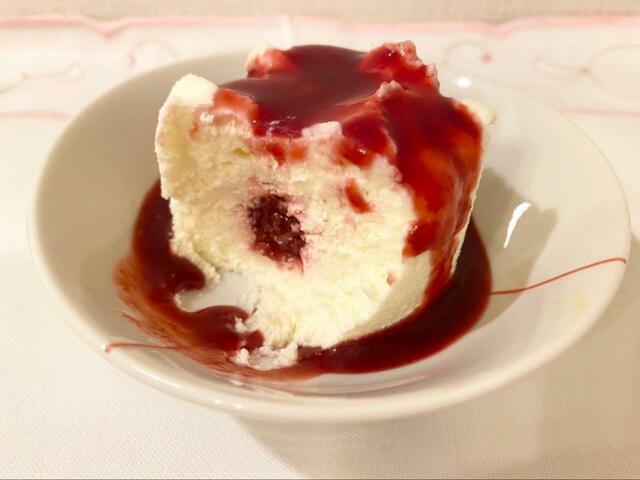 重さを感じずに、最後まで食べられるのは、ミルク強めの甘すぎない味と、ふわふわの食感、そしてラズベリーソースが鍵となっているようです。