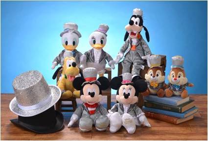 ユニベアシティとお揃いの、銀色のトップハットとジャケットを身に着けた、ミッキー&フレンズのぬいぐるみも、店舗限定で発売します。