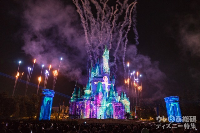 アナ雪の名シーンや名曲の数々が次々とシンデレラ城に映し出されます。