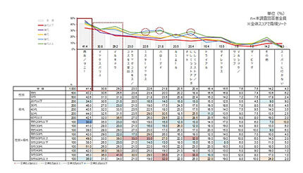 調査対象者に、普段よく行くスーパーをすべて答えてもらったところ(複数回答)、「西友/サニー」がもっとも多く、「マックスバリュ」「マルキョウ」がそれに続いた。「ミスターマックス」「ハローデイ」「にしてつストア/にしてつストアレガネット」は50代以上による利用が目立つ。