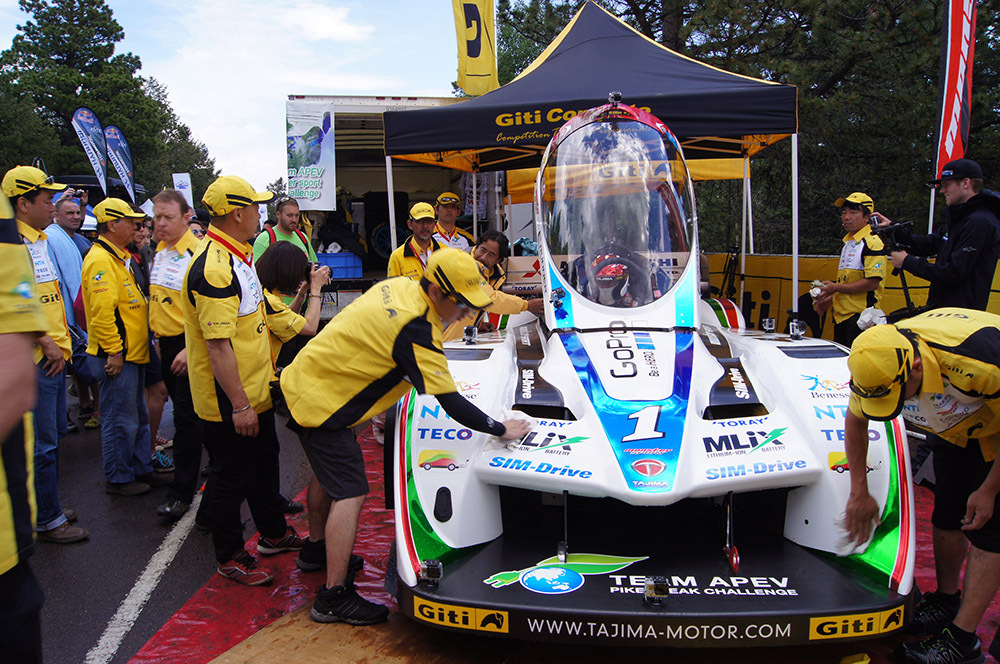 モンスター田嶋は、20年以上におよぶパイクスピーク・ヒルクライムへの参戦の中で何度か同じ状況を経験してきた。その結果、用意してあったカットスリックを選択。さらに追加でカットを施した。チームは慌ただしくタイヤの準備をし、マシンをスタートラインに並べた。