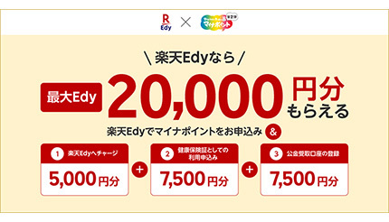総務省が実施するマイナンバーカード取得者を対象としたポイント還元施策「マイナポイント事業」の第2弾では、条件を満たすと最大2万円相当(キャッシュレス還元最大5000円相当+1万5000円相当)のポイントが付与される。楽天Edyは、第2弾のマイナンバーカードを新規に取得した人への最大5000円相当の付与に加え、「健康保険証としての利用申込」「公金受取口座の登録」を満たした人に対する1万5000円相当のポイント付与も開始した。マイナポイント第2弾に楽天Edyを選んだ場合、申込者は最大2万円相当の楽天Edyを獲得できる。