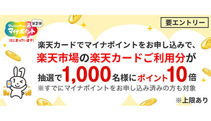今回、開催するキャンペーンでは、期間中にエントリーした上で楽天カードでマイナポイントの申し込み・登録した会員を対象に、抽選で1000名に楽天市場での楽天カード利用分のポイントを10倍にする。