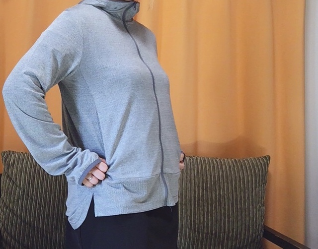 こちらは長袖のパーカーで、フード付きで首や上半身を紫外線からしっかり守ってくれるのに、通気性が良くて、長袖と思えないくらいサラサラで涼しい着心地です。