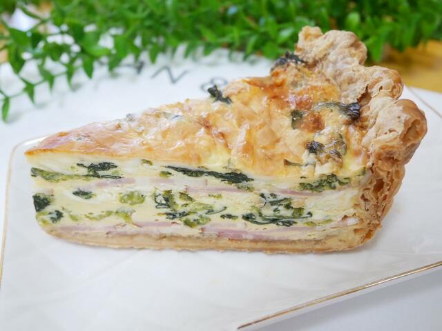 キッシュとは、ベーコンとほうれん草を加えたアパレイユ(卵、牛乳、生クリームなどを混ぜ合わせたキッシュのベース)をブリゼ生地で包み、サクサクに焼き上げたフランスの郷土料理。