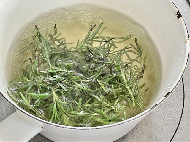 作り方は、洗ったローズマリーを小鍋に入れ、水を加えて弱火でじっくり煮込むだけ。