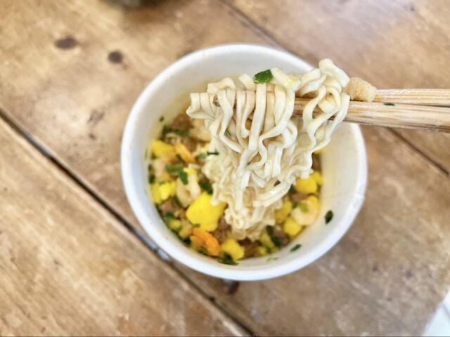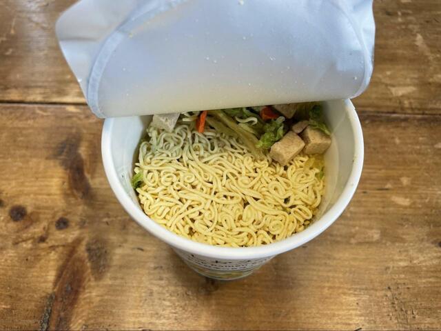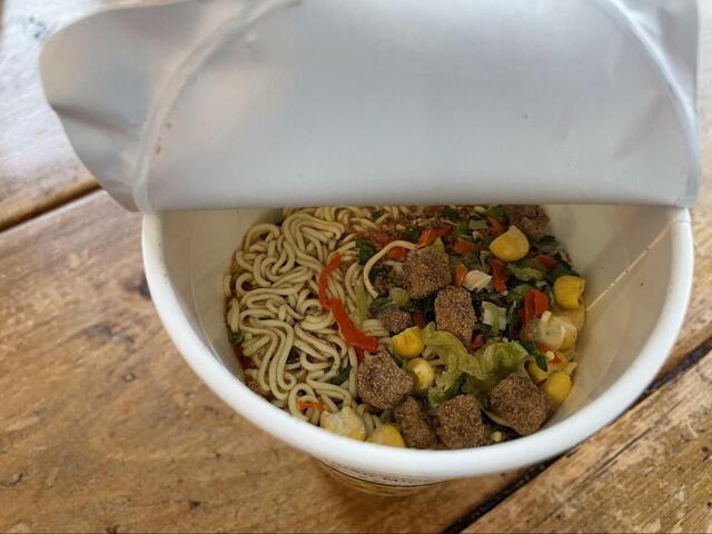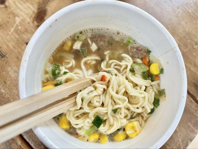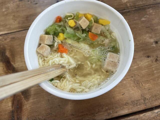 フリーズドライの野菜も、シャキシャキとした歯ごたえで、触感も楽しめるみそラーメンですよ。
