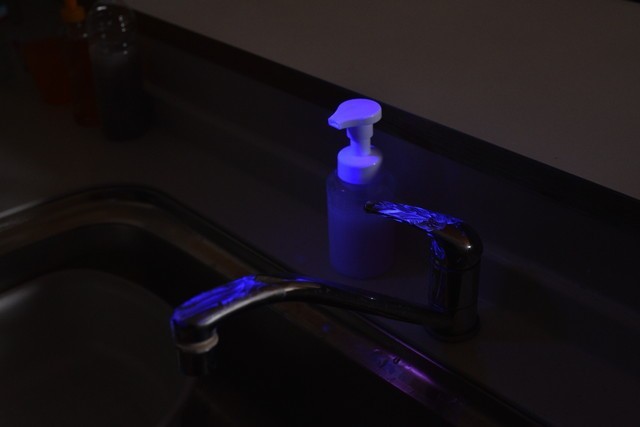 明かりを消してブラックライトを照射すると、手で触れた部分がぼんやりと青白い光を放ち、感染の様子が明らかに…!