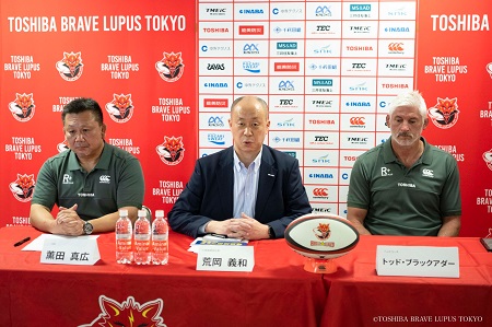 (写真左より)薫田真広GM、荒岡義和社長、トッド・ブラックアダーHC (C) 東芝ブレイブルーパス東京