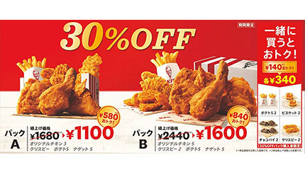 30%OFFパックは、オリジナルチキンと人気のサイドメニューの組み合わせを積み上げ価格から30%オフで楽しめる。オリジナルチキン3個、カーネルクリスピー1個、ナゲット5個、ポテト(S)で1100円(積上げ価格は1680円)の「30%OFFパックA」、オリジナルチキン5個、カーネルクリスピー2個、ナゲット5個、ポテト(S)で1600円(同2440円)の「30%OFFパックB」を用意している。