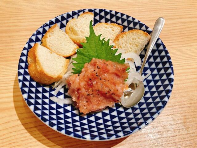 醤油とオリーブオイルで味付けされたマグロのたたきに、オニオンスライスとバケットを添えたもの。