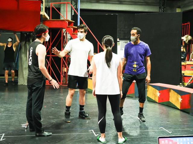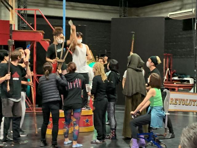本番仕様の仮セットが組まれた稽古場に入ると、そこはまさにサーカス小屋のよう。至る所でトレーニングが行われている。息を吸うように繰り広げられるアクロバット。サーカス・レプリケーターのKai Johnson-Peadyが中心となって、技がブラッシュアップされていく。