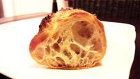 クラストは味噌のような香ばしい香りでカリッとしています。端のとがった部分はさらにカリカリでおせんべいのよう。クラムはもっちりして唾液とともにシュワーっと溶けて行きます。トースターで焼くと小麦の香りが強くなるように感じます。