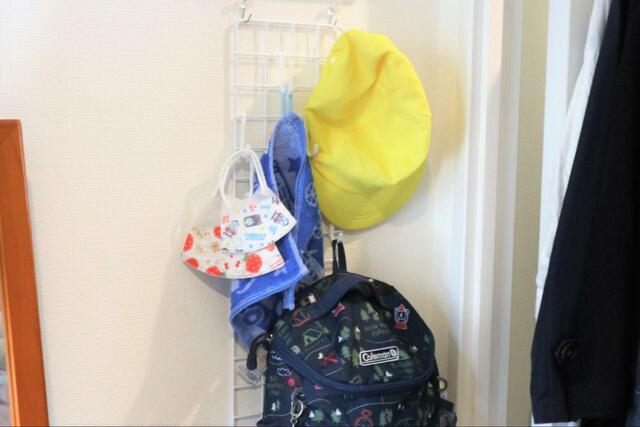 玄関のちょっとした壁面に、ハンカチタオルや帽子、リュックなど子どものお出かけアイテムを吊り下げてみました。