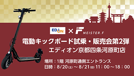 FUGU INNOVATIONS JAPANは8月17日に、エディオン京都四条河原町店のエントランス横広場において、パーソナルモビリティブランド「MEISTER.F」の公道走行に対応した電動キックボードと、重心移動で運転をコントロールする新感覚モビリティ「電動バランスボード」の試乗・販売会を8月20日・21日に開催すると発表した。