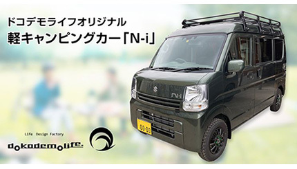 「ドコデモライフオリジナル軽キャンピングカー『N-i』」は、軽1BOXをベースとしたキャンピングカーで、取り回しのよいコンパクトなボディに2人で快適に就寝できる空間を兼ね備える。各部に設置された収納スペースや、女性でも簡単に展開が可能なベッドなど、使い勝手にこだわっている。