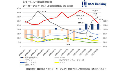 製品別の販売台数シェアを見ると、ソニーのVLOGCAM ZV-E10の人気ぶりがよくわかる。発売月の昨年9月、シェアは19.8%でトップ。見事なスタートダッシュを決めた。しかし製造が追いつかず販売が伸び悩み、受注停止でさらにシェアが急減。この5月には0.3%と、ほぼゼロまでシェアを落とした。受注再開後の7月は、再び2桁シェアの13.1%まで垂直的に回復した。同様にα6400も7月現在で9.2%で3位につけ、ソニーのトップシェア奪還に大いに貢献した。7月の2位は10.8%のキヤノン EOS Kiss M2。ライバルの休戦時には一時22.0%と2割を超えるシェアを獲得、長らくトップを走っていた。ソニーの復帰で、さすがに押されてはいるものの、依然2桁シェアは維持できている。
