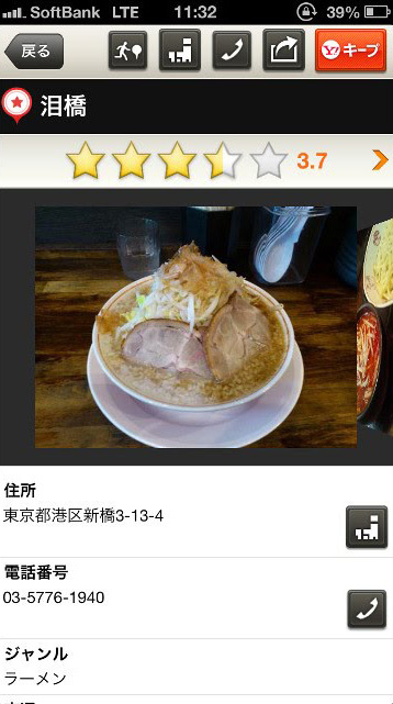 たとえば新橋エリアで「ジャンルから検索」→「グルメ」→「ラーメン」と選択すれば、瞬時にラーメン屋さんをピン表示! 締めのラーメン屋探しに、ひと息入れたいときのカフェ探しに、近場のお店をサクッと探しましょう。