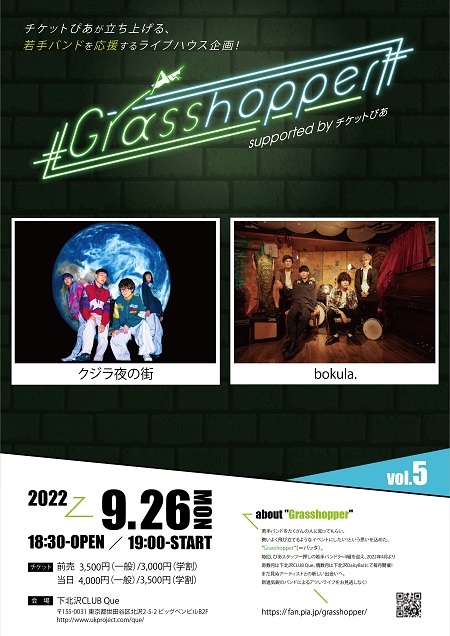 5回目となる「Grasshopper vol.5」は9月26日(月)下北沢CLUB Queにて、「クジラ夜の街」と「bokula.」の2マンライブで開催することが決定した。