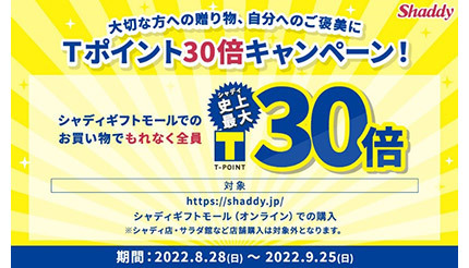 シャディとTポイント・ジャパンは8月28日~9月25日の期間、ECサイト「シャディギフトモール」にて買い物をした人を対象に、Tポイントを通常の30倍プレゼントする「大切な方への贈り物、自分へのご褒美に Tポイント30倍キャンペーン!」を実施する。