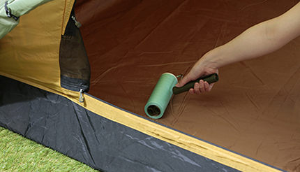 コロコロ テントクリーナーは、テント生地にくっつきにくい粘着剤を使用し、凸凹した場所でも砂利、草、食べカスといったゴミをキャッチしやすいクッション性のある素材のテープを使用している。。