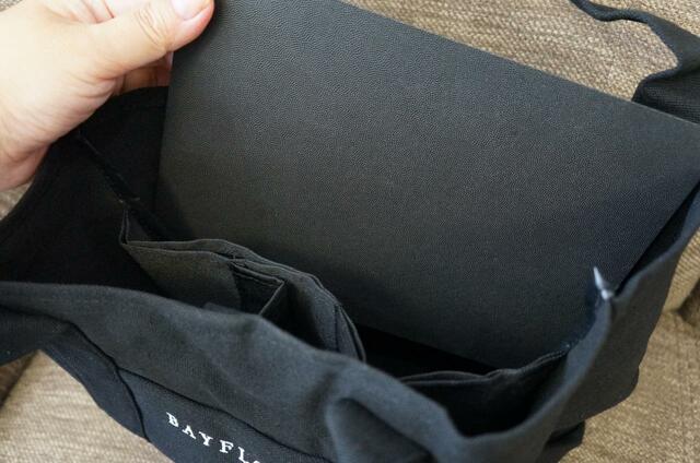 フロントポケットにはおしゃれなロゴとトリコロールのタグ付き。主張しすぎないデザインでベイフローらしさが出ています。