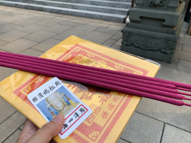 金紙と線香を持って、神殿に移動します。内部に入り、媽祖様へ金紙を供えます。お線香に火をつけてもらい、1~5の順番に香炉を回ってそれぞれに手向けます。