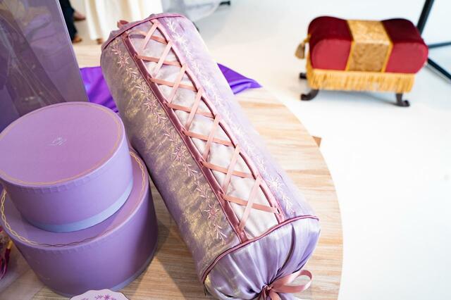 ラプンツェルのクッションはボルスター型で、彼女のドレスを表現しています。
