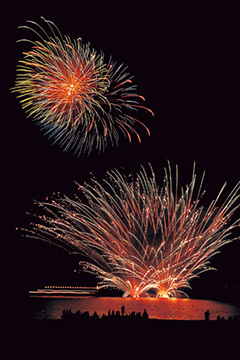 ★【水中】水中花火を実施 ★【海】海辺で行われる ★【音楽】音楽と連動した花火が打ち上がる ★【万発】1万発以上打ち上がる ★【滝火】仕掛け花火(ナイアガラ)実施 ★【競技】花火コンクール(競技会)実施 ★【川湖】川畔や湖畔で行われる