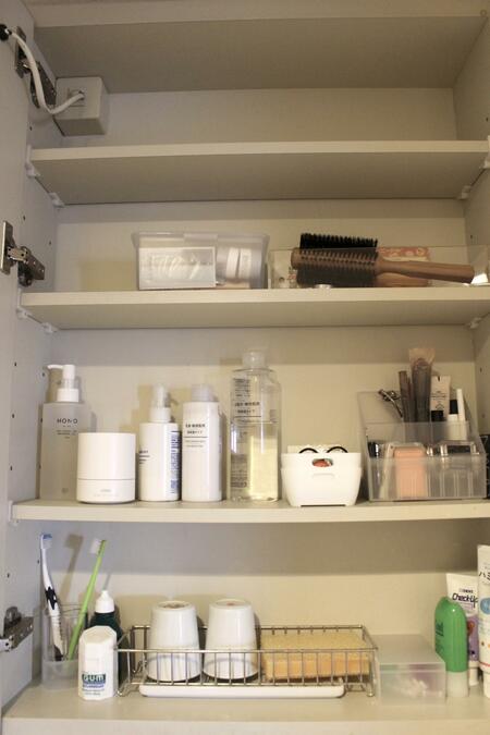洗面台収納がキレイに片付きました!下の段は歯磨き類に、その上の段をメイク道具や化粧水などというふうに分けてみました。
