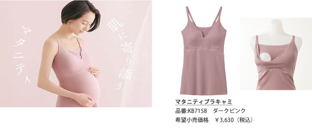 敏感になるお肌やサイズアップするお腹や胸にも対応した設計と、簡単に胸の出し入れができる機能やシック部の消臭・撥水機能などが盛り込まれたブラジャーやショーツは、ママに寄り添う優しい商品です。