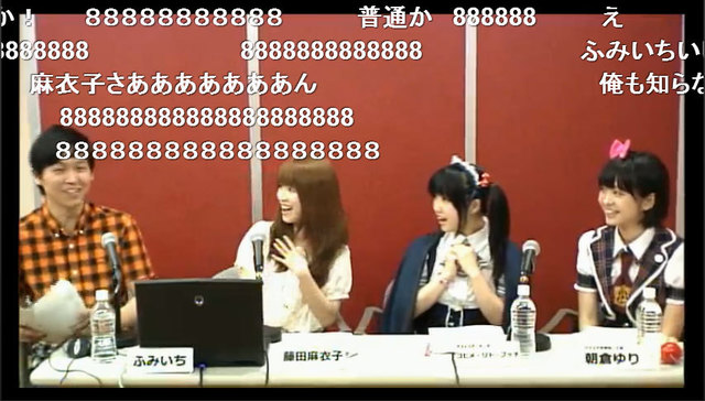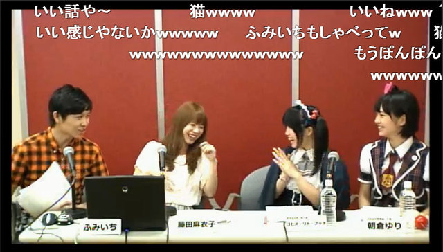 さらにさらに、番組開始早々、ふみいちさんと藤田さんが実は同じ名古屋出身で同郷だったことが判明! しかも緑区出身で学区が隣だったことも明らかになり、がぜん話が盛り上がります。とはいえあまり細かくバラしちゃうのもまずい……ということで、ふみいちさんと藤田さんが選んだのは、トーク番組にあるまじき(?)耳打ちしながらのローカルトーク! これにはニコ生視聴者からも「ふみいち仕事しろw」「なんだこれw」「いちゃいちゃw」といった総ツッコミが。それにしても地元トークをしているときの藤田さんの笑顔、最高に素敵でした!