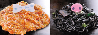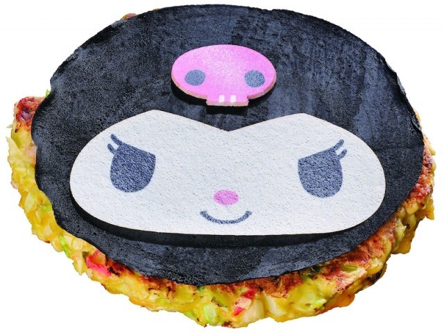 お好み焼き(1296円は「ピンクの生地」もしくは「黒い生地」をかぶせ、特注の「顔シート」と「リボンモナカ・ドクロモナカ」をデコレーションすることにより、マイメロディとクロミの顔を再現できるという、味だけでなく見た目も楽しめるコラボメニュー。