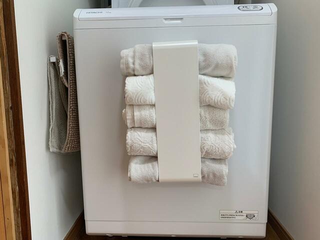 洗濯機にマグネットで設置し、バスタオルをセットしてみました。
